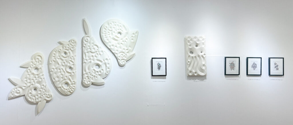 Noriyo OGAWA’s Web Site(noriyo.jp) 【イベント】 出展情報です。開催期間・時間等の詳細は、各美術館・ギャラリー様のWebサイトをご覧くださいませ。 ■第76回モダンアート展(東京都美術館(上野)) 2026年4月2日(土)〜4月16日(土) モダンアート協会様のWebサイト https://www.modernart-kyokai.com/ 佳作賞 タイトル:「天・地・水」 素材等:ニット、木、糸、PVC サイズ:1300mm×1620mm ■第16回 輪展(K’s Gallery) 2026年3月9日(月)〜3月14日(土) K’s Gallery様のWebサイト https://ks-gallery.jp/ 【ピックアップ】 「第75回 モダンアート展」出展作品(2025年4月2日〜16日/東京都美術館) 作品: 『Nの断面』 サイズ:1620mm×1300mm 使用素材:綿ニット、木、糸、PVC 「素材の出会い展」出展作品(2017年2月6日~11日;「画廊るたん」) 作品:(左から) 『ニューロフローラA』 『Nの風景 「息」はたるぶくろ』 『Nの風景 「翔」ばら』 『ニューロフローラB』 The 9th International Biennial of Textile Miniatures “Out of the Box” June 19 – July 11 入選作品 作品: 『ヌノ〈cloth〉科植物・ニューロンフラワー』(左) 『ヌノ〈cloth〉科植物・ニューロンフラワー II』(右) サイズ:各20cm×20cm×6cm(2015年5月) 使用素材:綿ニット・木・樹脂・染料 新着情報 2026年4月1日 NEW! 第76回モダンアート展(東京都美術館(上野))に出展します(2026年4月2日(土)〜4月16日(土)) 2026年3月7日 第16回 輪展(K’s Gallery)に出展します(2026年3月9日(月)〜3月14日(土)) 2025年2月22日 第75回モダンアート展(東京都美術館(上野))に出展します(2025年4月2日(水)〜4月16日(水)) 2025年2月22日 第15回 輪展(銀座K's Gallery)に出展します(2025年3月10日(月)〜3月15日(土)) 2025年2月22日 TODAYS ART ACTION 2025(千疋屋ギャラリー)に出展します(2025年3月4日(火)〜3月9日(日)) ◆『ヌノ〈cloth〉科植物』とは… 私を通して生の継承をしている植物たちのことです。自然界に存在する生命力豊かなすべての植物たちに導かれながら、私の手を通して標本化(レリーフ)したものの総称です。 コンセプト 綿の柔らかさは、その感触に加えて素材自体が、光を吸収しながら陰影を映し出すところにも一因すると考えます。この要因に着目し、植物の生命力豊かな姿を重ねることで、やわらかな陰影が浮かびあがらせる表情を、作品にする試みを続けています。 ◆『瞑想』(ニューロンのメディテーション)シリーズについて 指先から意図しない表現を創出する瞬間というものは、もしかしたらニューロンのいたずら、あるいは瞑想の領域にある“何か”かもしれません。このイラストは、ネイチャーを題材にしつつ、自分の有り様を追求した偶然の産物をテーマとしたものです。 ◆『一日一花』シリーズについて この誕生花イラストのシリーズは、その日の誕生花とされている植物を毎日スケッチして365日分描きためたものです。日々の誕生花には、必ずしも決まった花があるわけではないようですが、いくつかの候補の中から選んで描きました。今月の花たちのイラストをご覧ください。